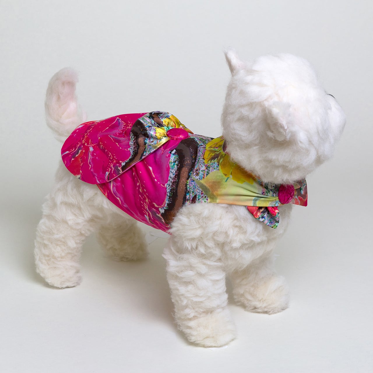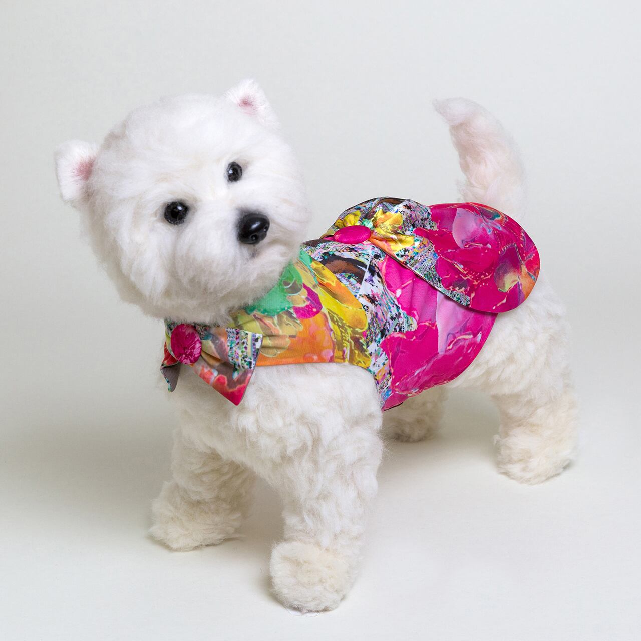 *伸縮する生地を使用しているため、胴回りや首周りは上記サイズまで調整が可能です。胴回り、首周り共にマジックテープを使用しています。