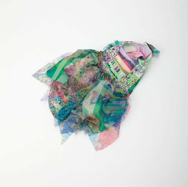 裾のドレープが優雅になびくスカート・チューブドレス。お散歩にもフォーマルな場にも活用できます。服地はボディ部分とスカート部分の素材と模様を変えて、立体的に配しています。トップのボタンなども一つずつハンドメイドの1点物です。