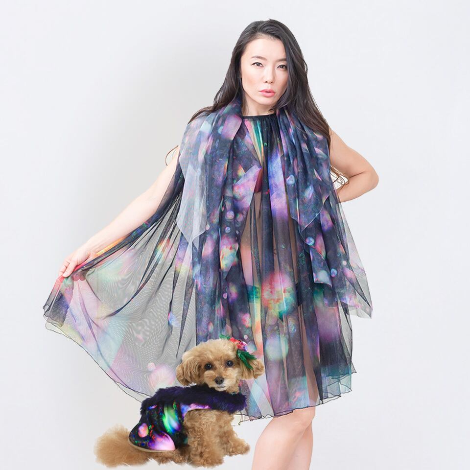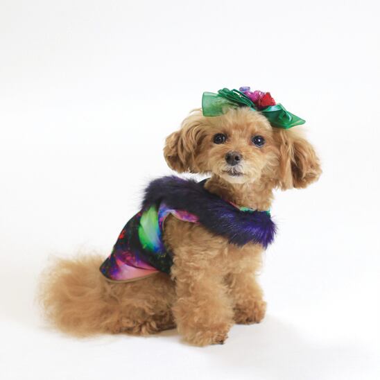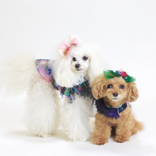 お散歩、パーティ、撮影はもちろん、オーナー様のフォーマルな装いともマッチし、ファミリーファッションを一緒に楽しんでいただける作品になっています。